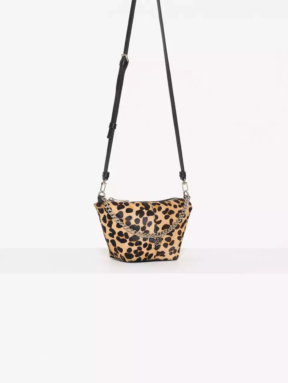 Bandolera Moon Wild confeccionada en cuero pelo con detalles en cuero vacuno. Viene con un bolsillo interno con cierre, correa regulable y cadena metálica al frente. Incluye apliques personalizados JCH que suman identidad y estilo.