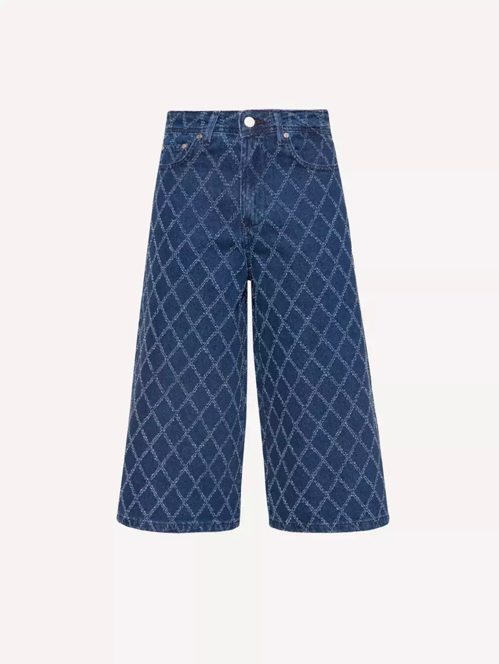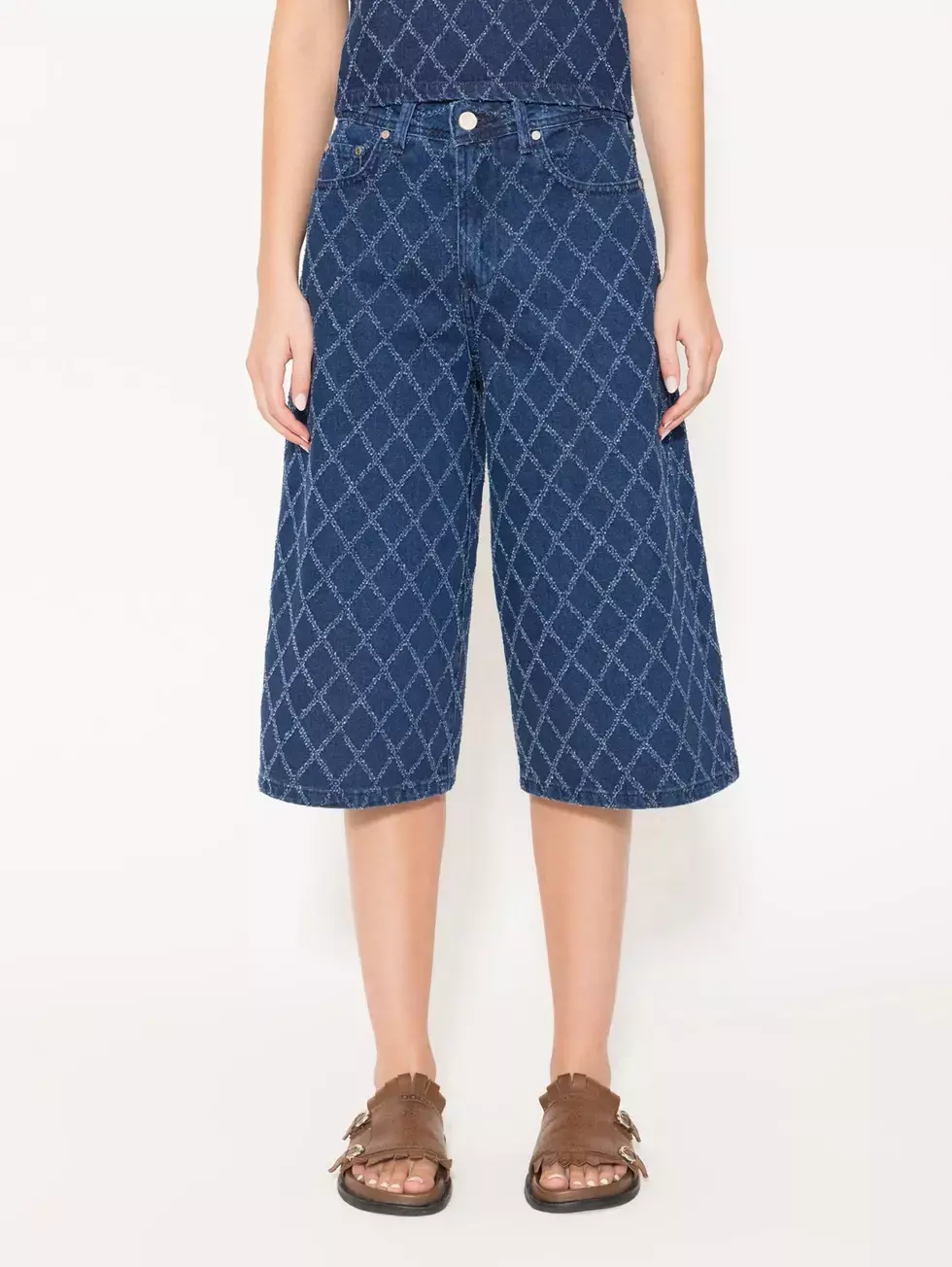 Bermuda Square confeccionada en denim 100% algodón, sin lycra, lo que le da una estructura firme. Su diferencial está en la textura y el diseño de rombos incorporados en la trama del tejido, que la convierten en una prenda única dentro del universo del denim clásico.