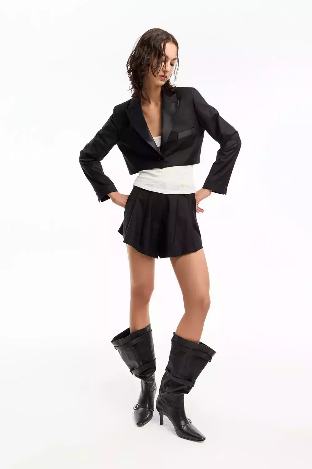 Blazer corto de manga larga con solapa y bolsillo de pecho en tela brillosa. Aporta un look elegante y sofisticado. Se recomienda usar con Short Lucky y Pantalón Lucky para un total look.