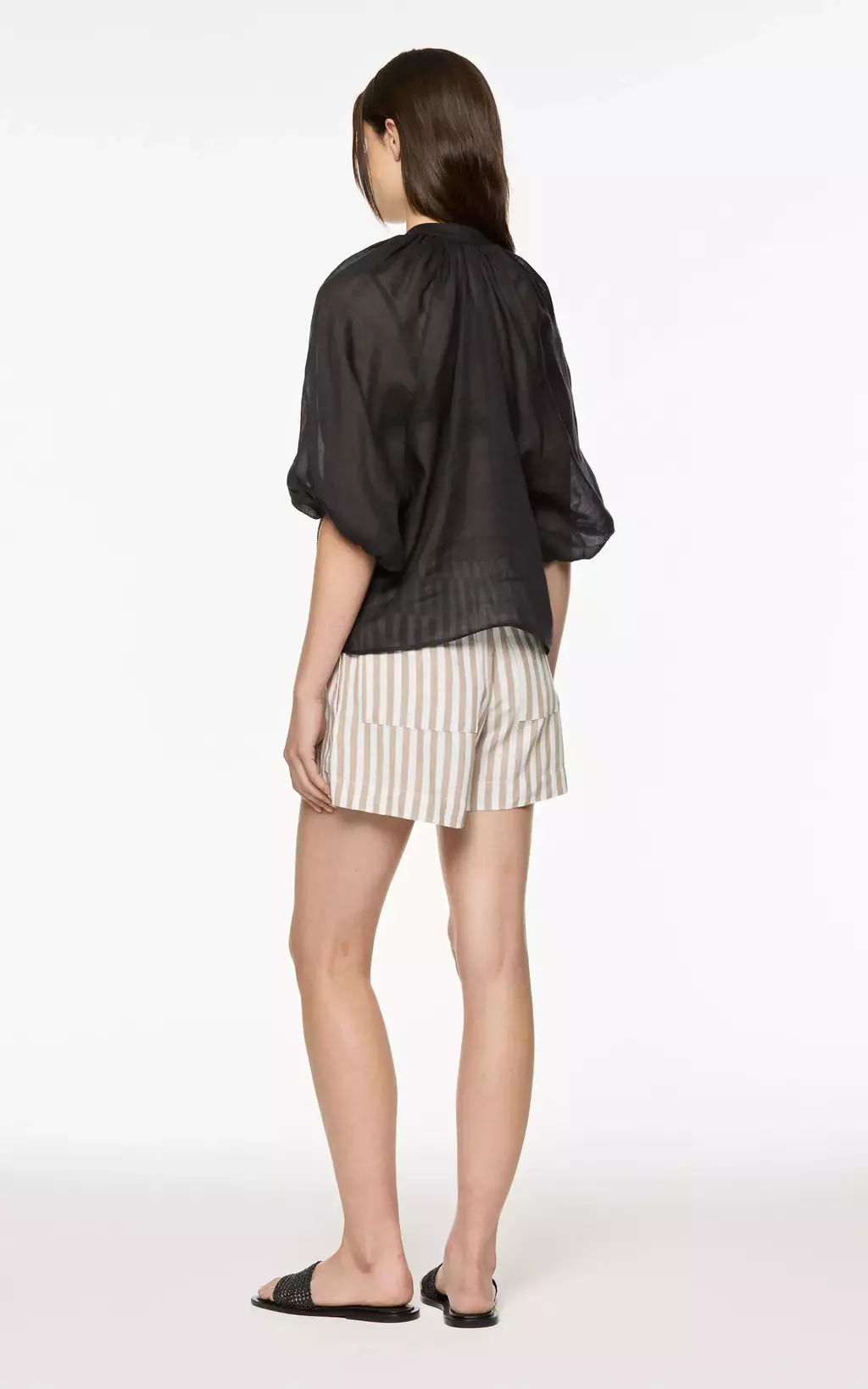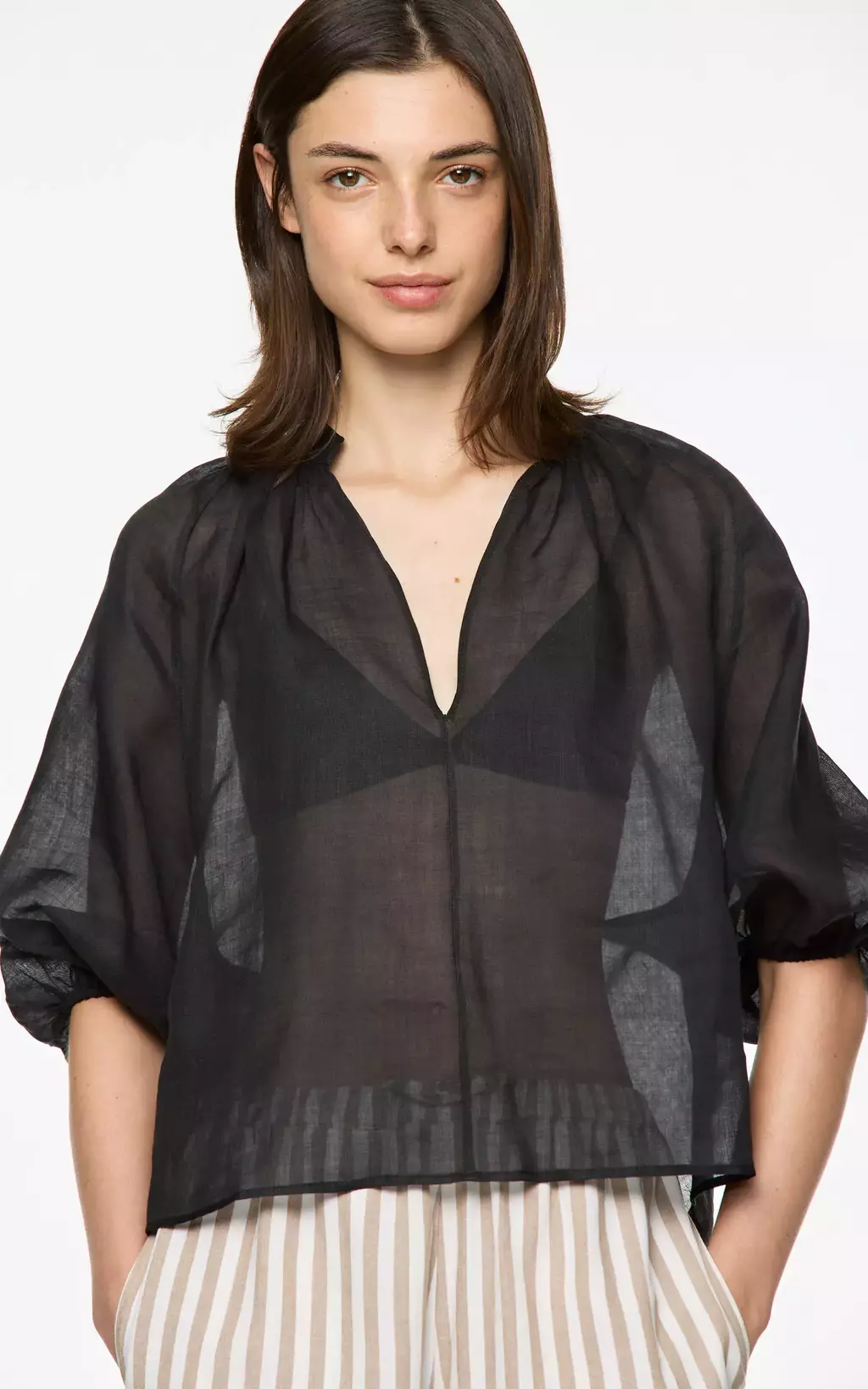 Blusa holgada cuello redondo con frunces. Abertura de escote en "v". Posee mangas amplias tipo bombe con elastico en puño de manga. Tela diferenciada. Diseñada para acompañar looks frescos y auténticos, sin resignar comodidad ni estilo.