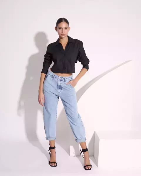 Camisa con corte recto de poplín de algodón, con cuello y mangas clásicas. Su largo es a la cintura y en la espalda tiene dos lazos para regular el ajuste de la prenda. Detalle de botones personalizados de la marca.