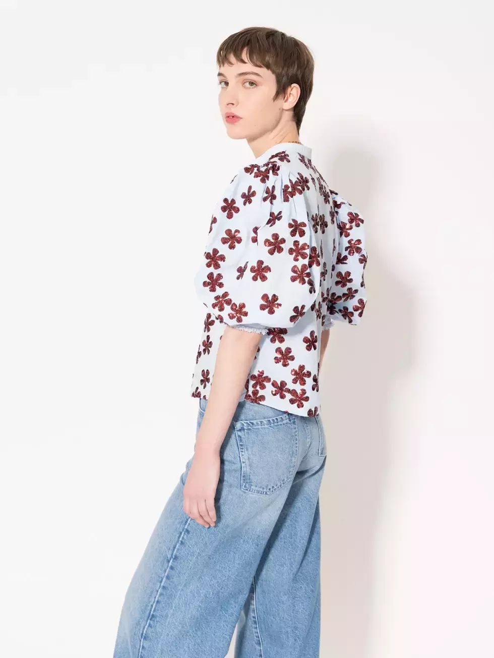 Camisa Lily de cuello mao, con lazo para atar. Lleva flecos en los puños. Su acceso es mediante cartera oculta. Está confeccionada en poplin con bordado de lentejuelas.