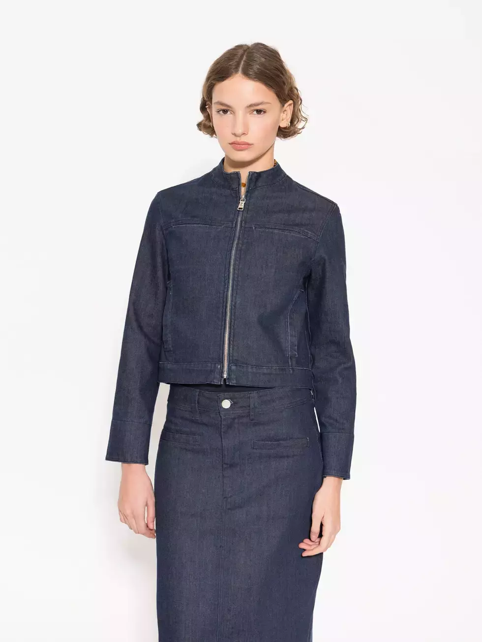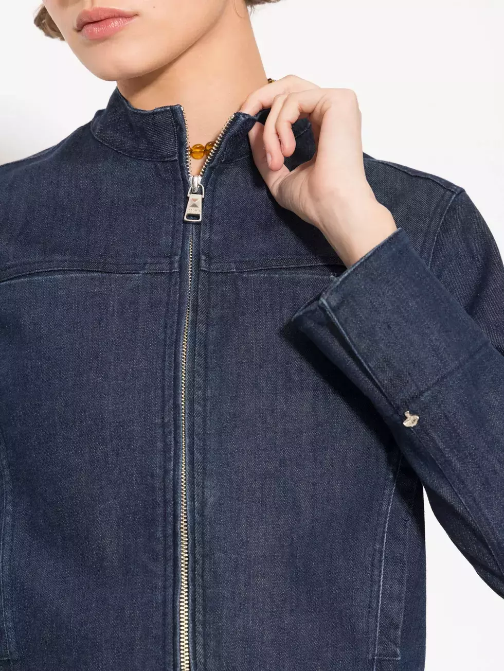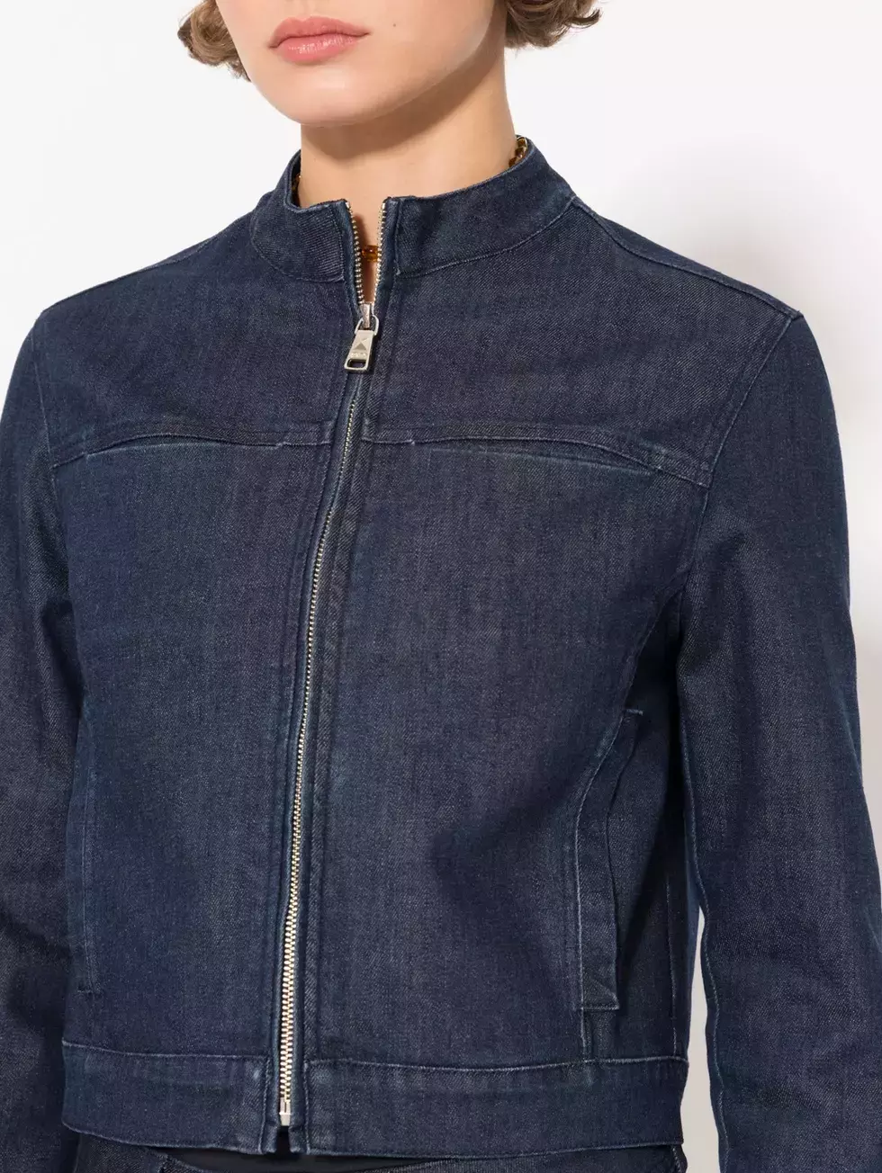 Campera Fungi, slim fit, ajustada al cuerpo de estilo tipo biker. Su cuello es mao y sus bolsillos con cierres horizontales. El lavado es sutil, dándole protagonismo al azul pofundo y natural del tejido. Como todo el tejido de denim puede sguir perdiendo color en los primeros lavados o en contacto con superficiles claras, tener precacación.