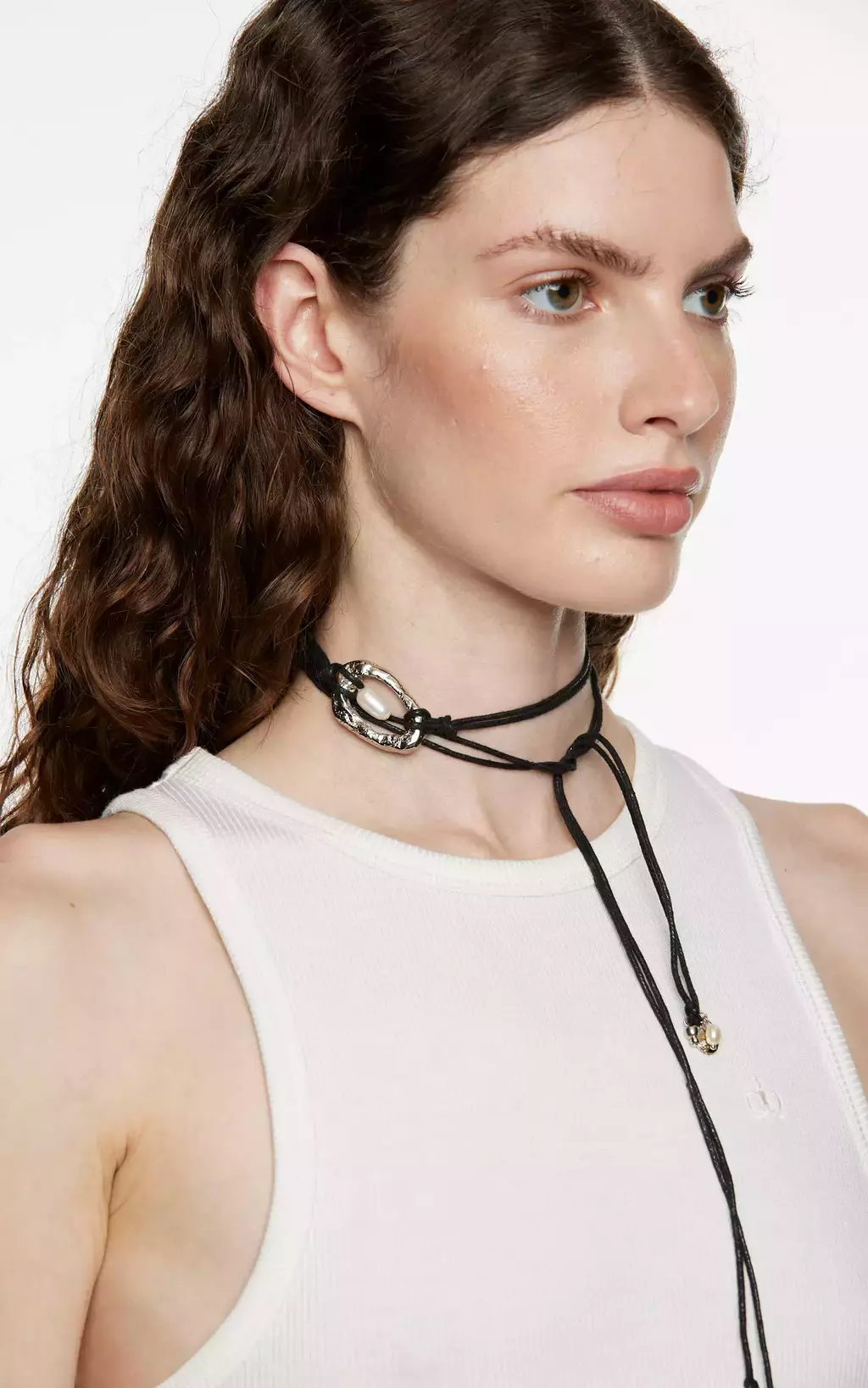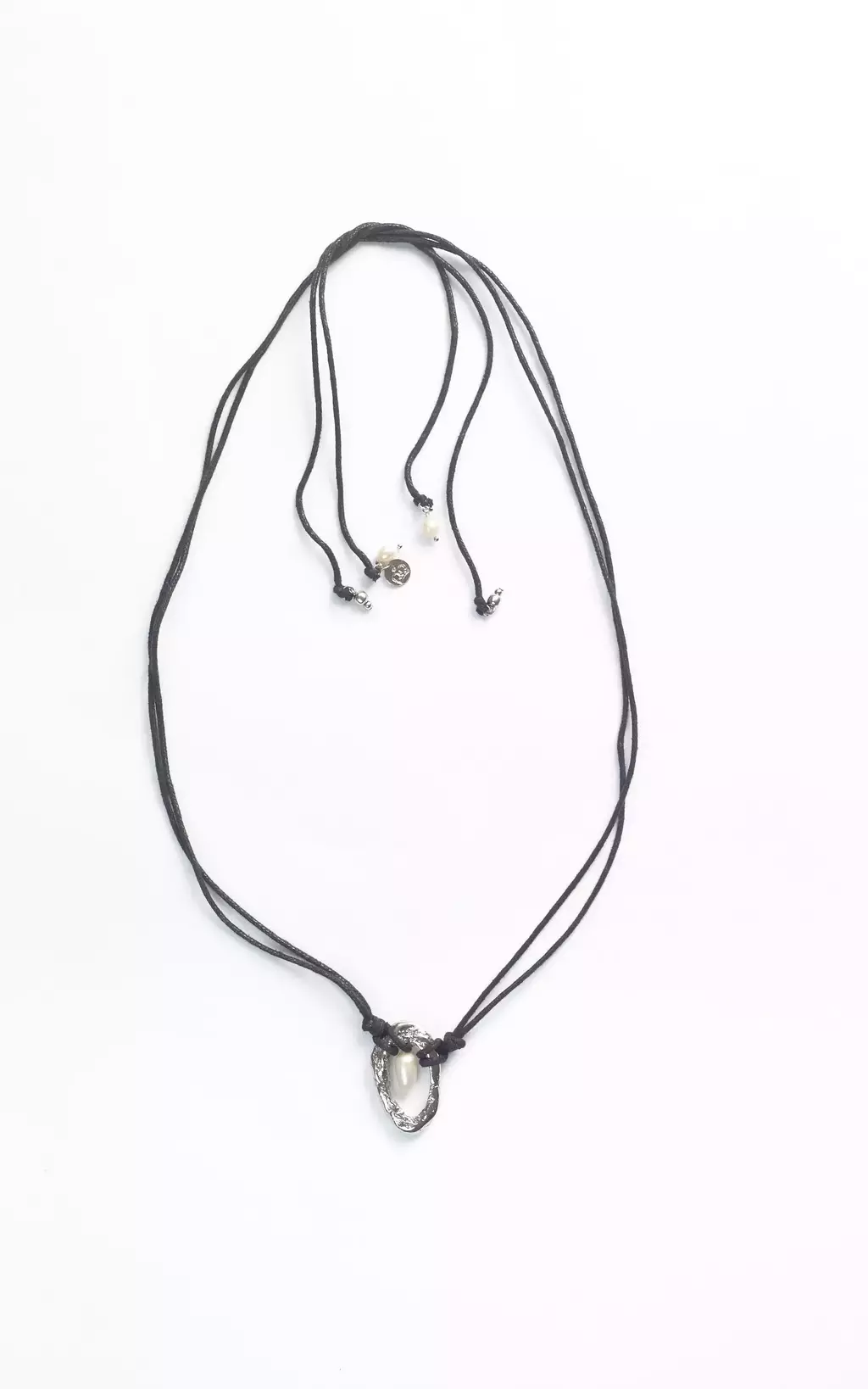 Gargantilla desarrollada con dije metalico con perla en su interior. Posee cordon de algodón encerado con perlas y mostacillas metalicas en sus extremos y chapita metalica marcaria. Ideal para realzar escotes o complementar conjuntos livianos con un detalle artesanal y distintivo.