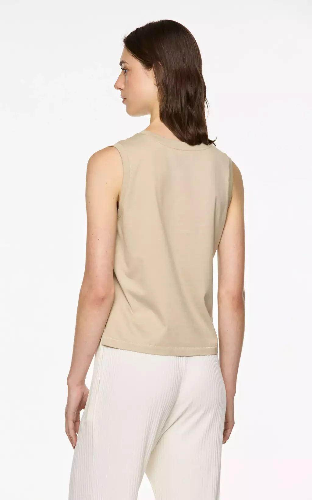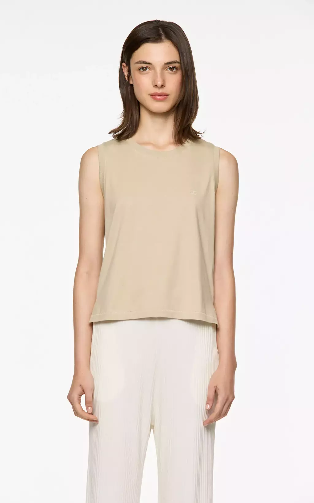 Musculosa básica de punto, largo por arriba de la cadera y con escote redondo a la base. Tiene tajitos en los laterales. Lleva corona en hd en el delantero. Producto fabricado en perú. Una prenda imprescindible para la temporada, ideal para sumar a looks relajados o urbanos.