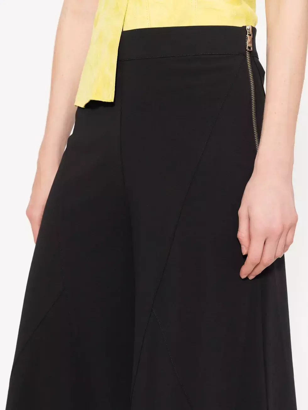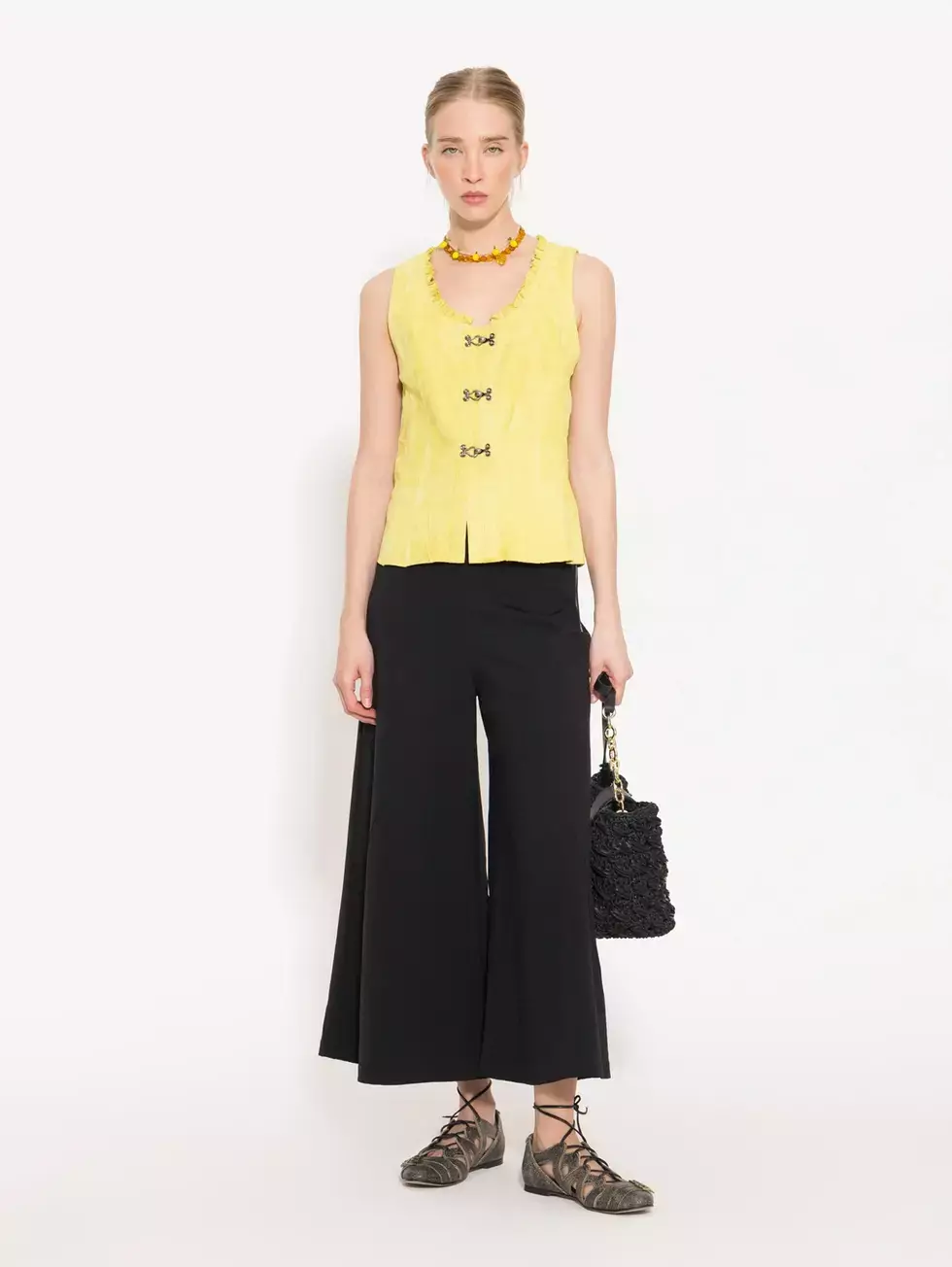 Pantalón Aurelia confeccionado en tejido de punto con cintura completamente elastizada. De piernas amplias con recortes diagonales que aportan diseño y movimiento.