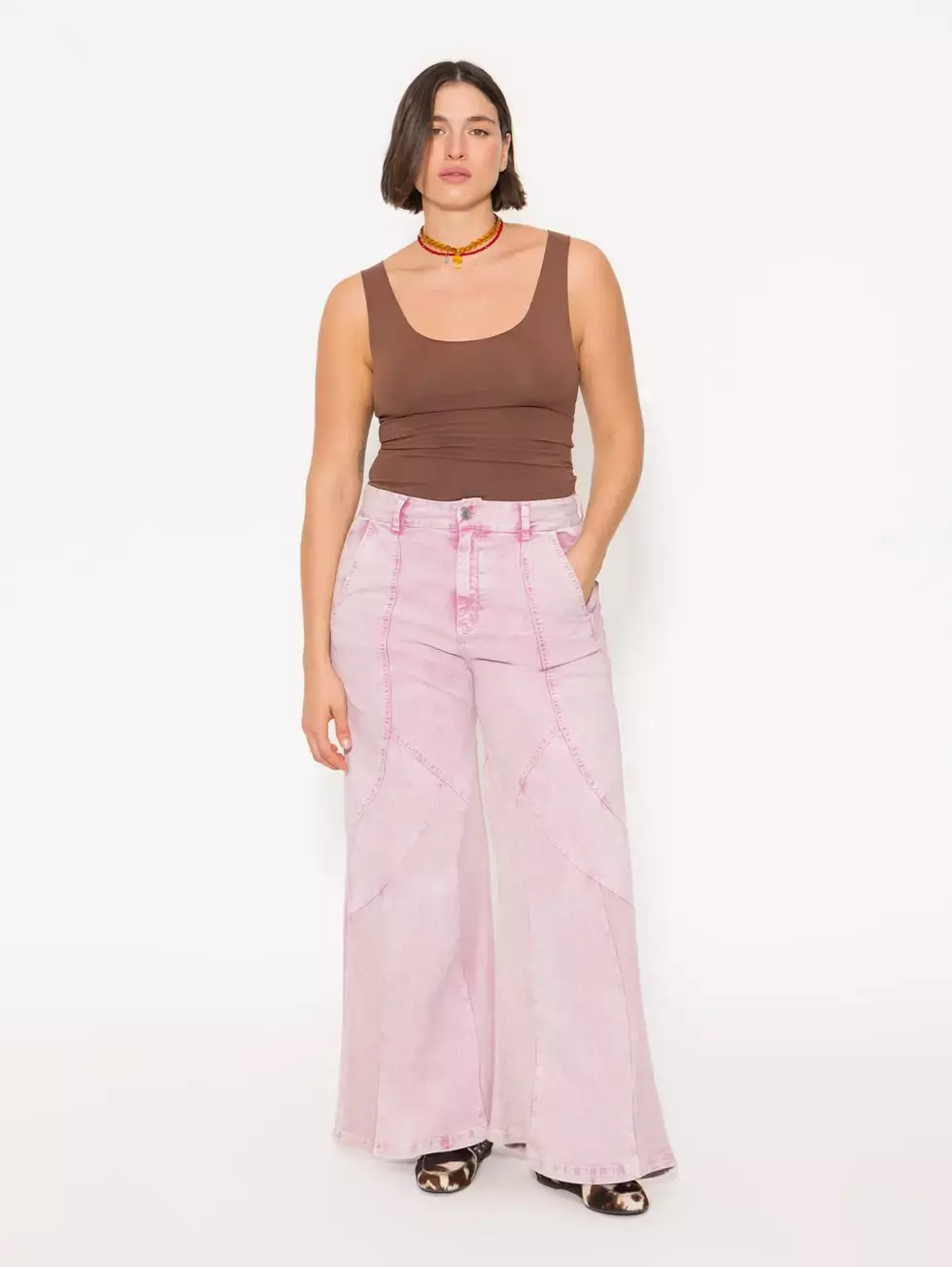 Pantalón Carmy de fit wide confeccionado en una combinación de tejidos planos y de punto que aportan textura y diseño. Posee recortes curvos en las piernas y costuras destacadas gracias al efecto del lavado. Presenta bolsillos diagonales en el frente y bolsillos plaqué en la espalda, aportando funcionalidad y estilo.