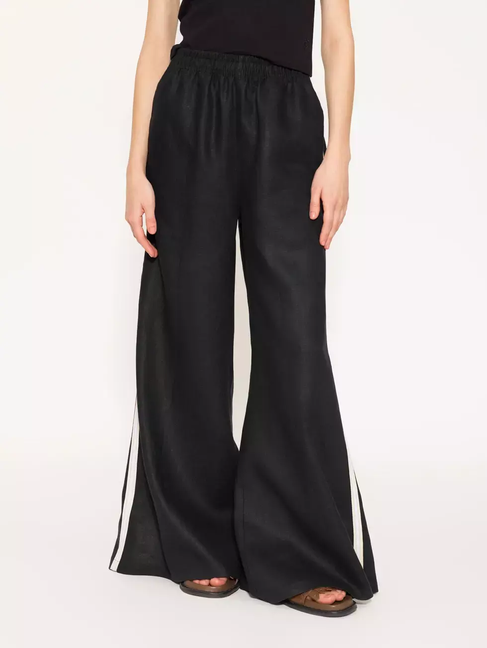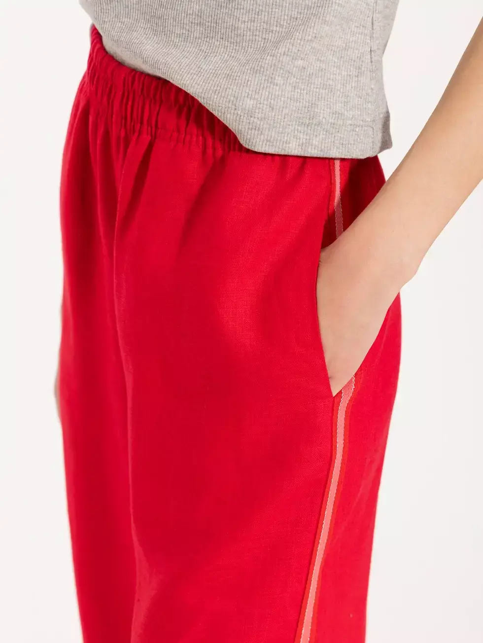 Pantalón Edimburgo de calce wide leg y tiro medio, confeccionado en lino. Su diseño incluye cintura elastizada para mayor comodidad, bolsillos delanteros y cinta espiga en laterales que suman un detalle distintivo. Una prenda fresca y versátil, ideal para looks relajados y elegantes.