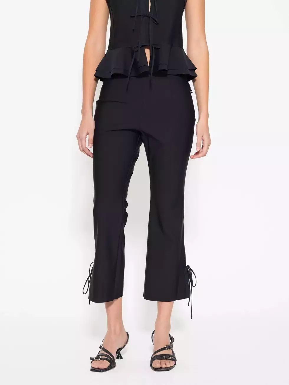 Pantalón Julieta con cintura rebatida y acceso en lateral mediante cierre de níquel. Lleva pinzas que entallan en delantero y espalda; y un tajo en ruedo terminado con bies de poplín y moño. Fit flare.