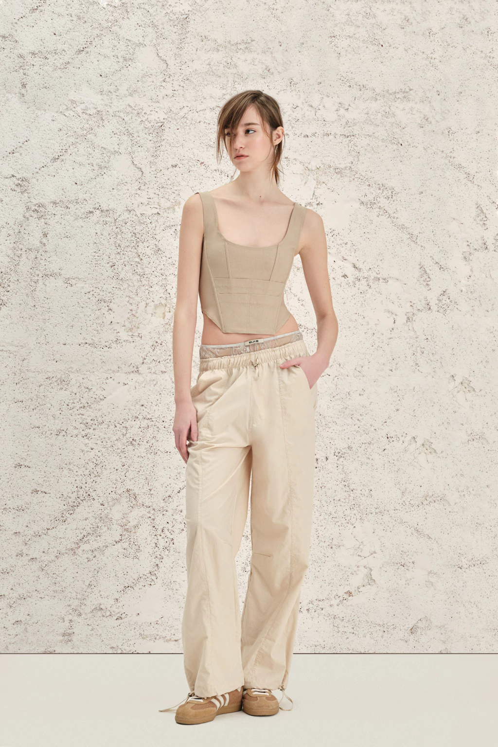 Pantalón tiro medio de eco fiber con bolsillos y cintura elástica, tiene tancas plasticas para ajustar la cintura y los puños.