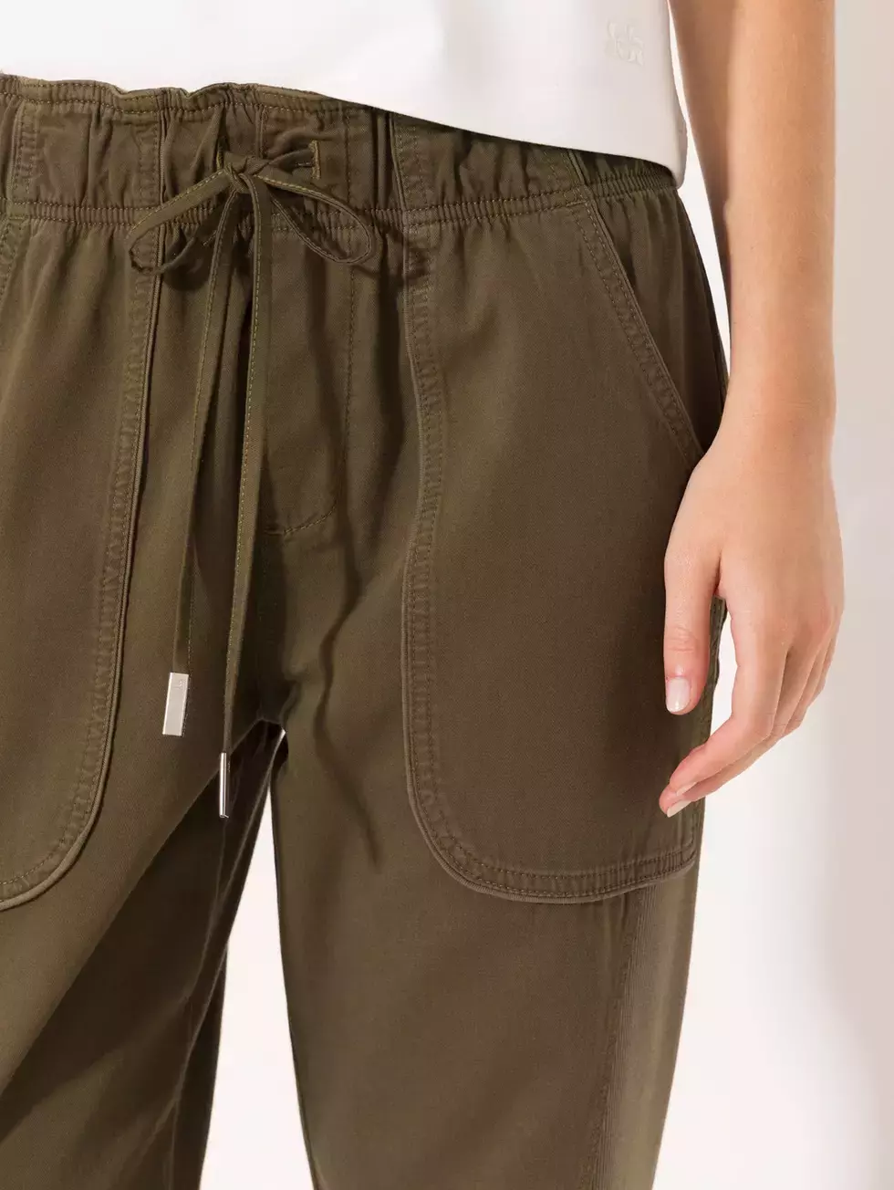 Pantalón Light de estilo babucha, confeccionado en combinación de textil de punto y plano. Lleva cintura elastizada con cordón ajustable y largo al tobillo para un look relajado y cómodo.