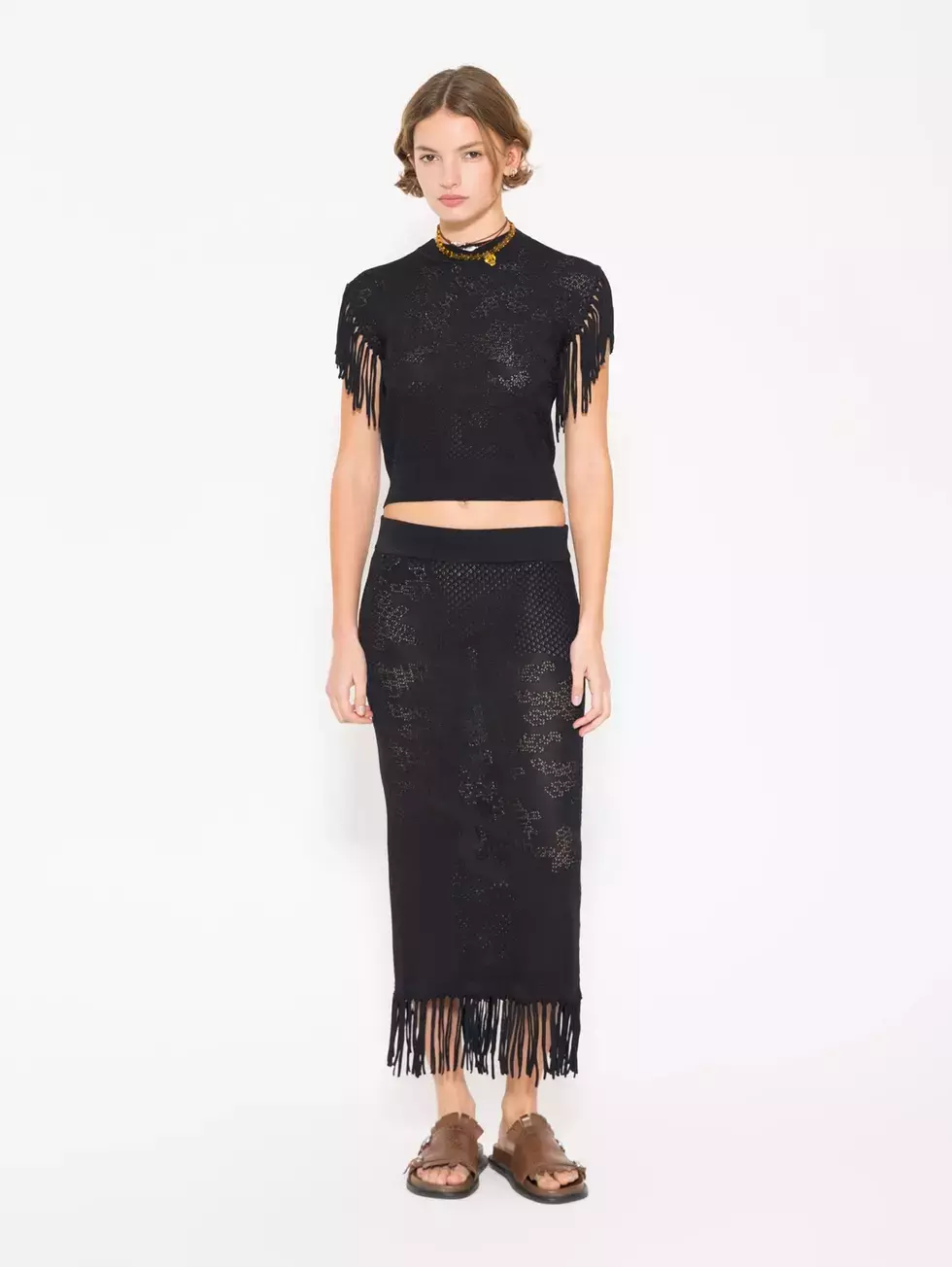 Pollera Chili tejida en puntos calados, al cuerpo, largo arriba de tobillos. Su fit es al cuerpo.