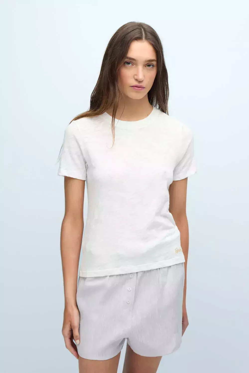 La Remera Aruba, confeccionada en jersey flamé peruano, es de calce clásico, con escote a la base, manga corta y largo a la cadera. Cuenta con bordado metálico en frente a modo distintivo. Es la prenda comodín infaltable en tu placard.