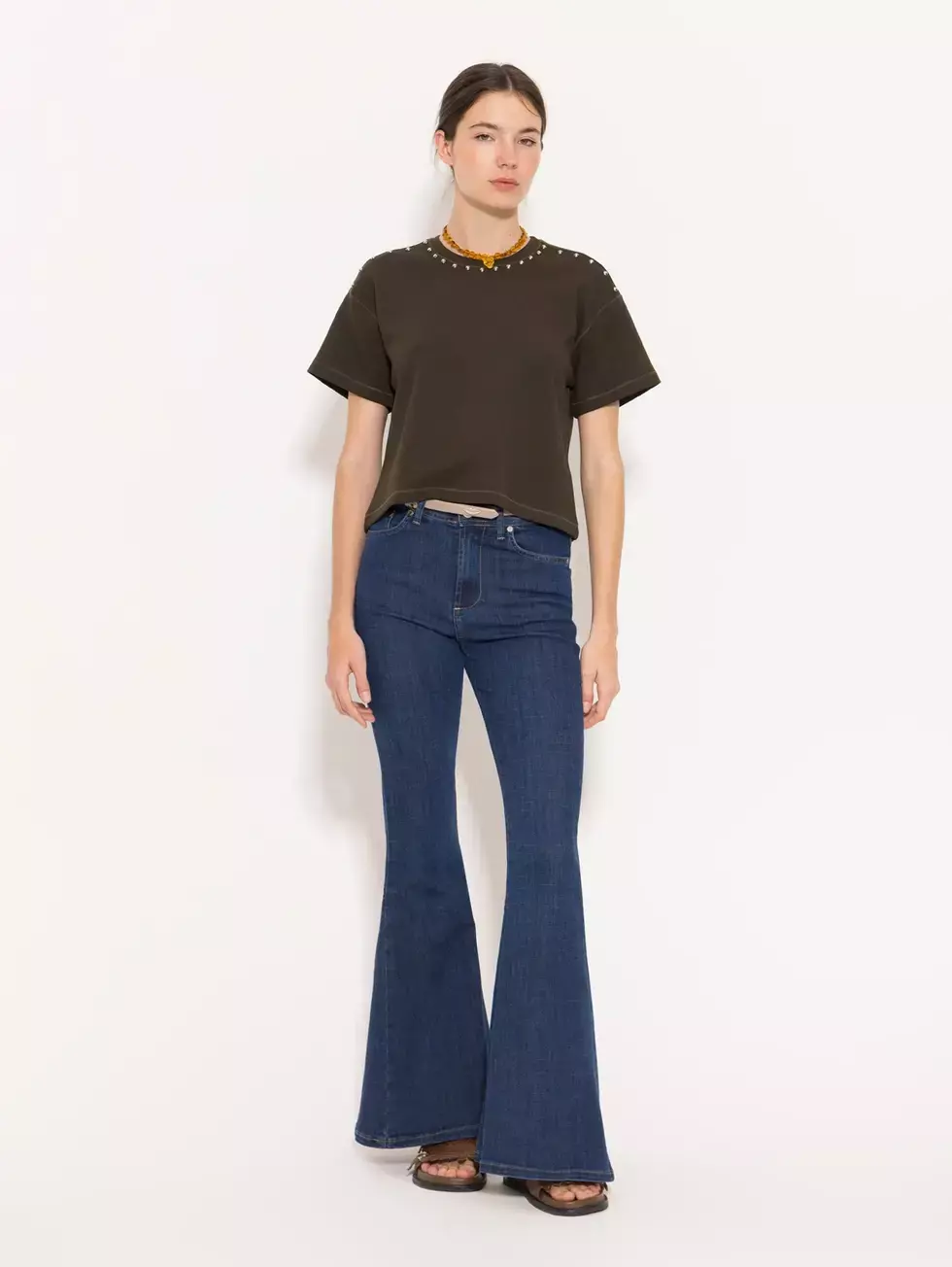 Remera Eloise confeccionada en tela de punto pesada que aporta estructura y caída. Lleva tachas aplicadas a mano en línea de escote y hombros. Es de mangas cortas y escote redondo