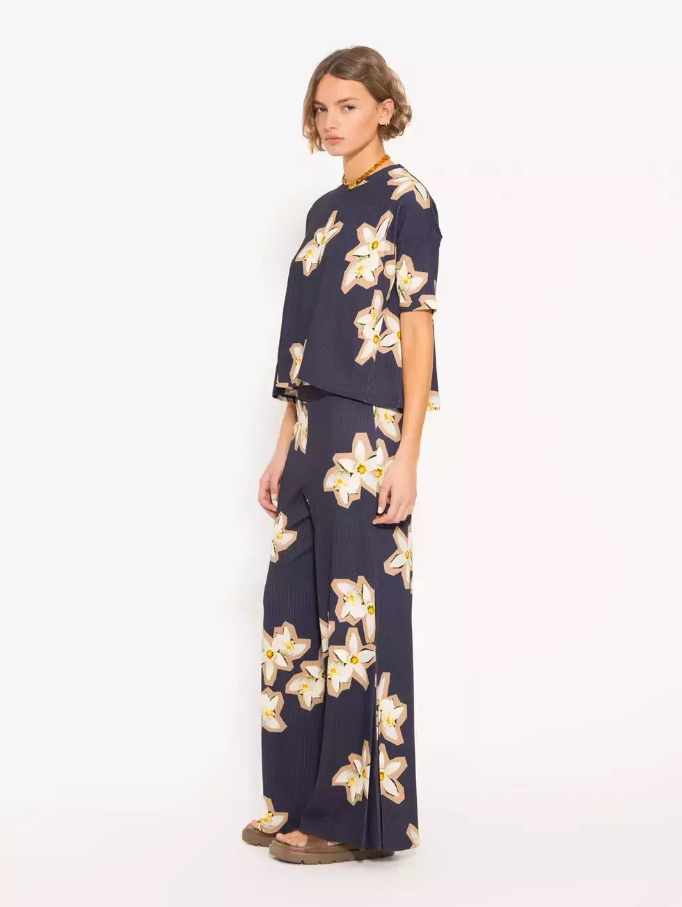 Remera Flower en punto estampado full print. Con escote redondo y recortes laterales que aportan amplitud y comodidad. Su fit es amplio. Es una prenda femenina y versátil para el día a día.