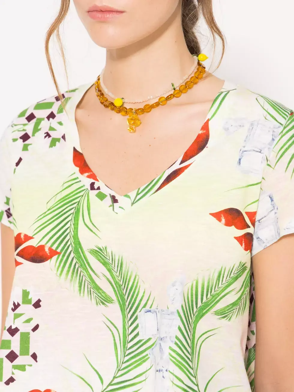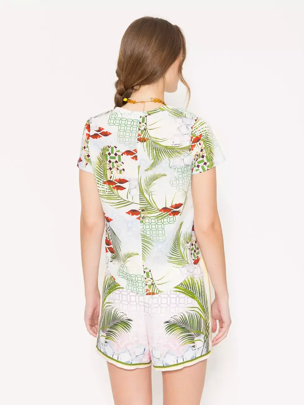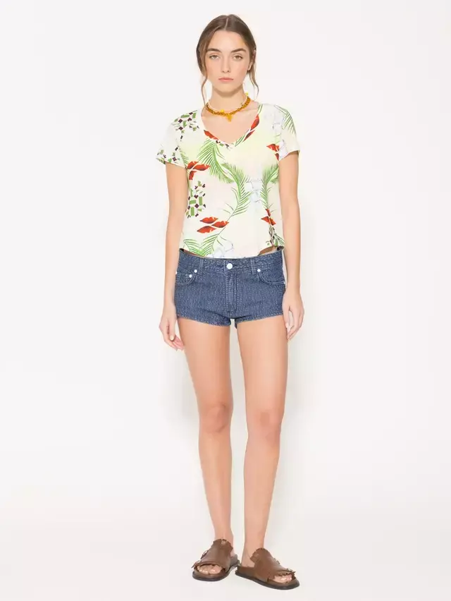 Remera Ice confeccionada en jersey flame estampado, con cuello en V y recorte en centro de espalda. El ruedo es curvo, lo que le da una caída suave y favorecedora. Ideal para un look fresco y casual.