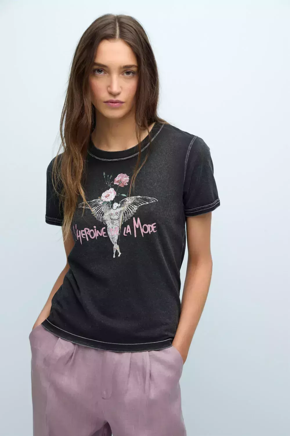 La Remera Mode, confeccionada en jersey de algodón peruano, es de calce clásico, con escote a la base y manga corta. Cuenta con un proceso de teñido artesanal en prenda que puede variar en cada una, haciendolo un ítem único. Presenta estampa posicional en frente con detalle de glitter. Súper canchera, para completar tu outfit de todos los días.