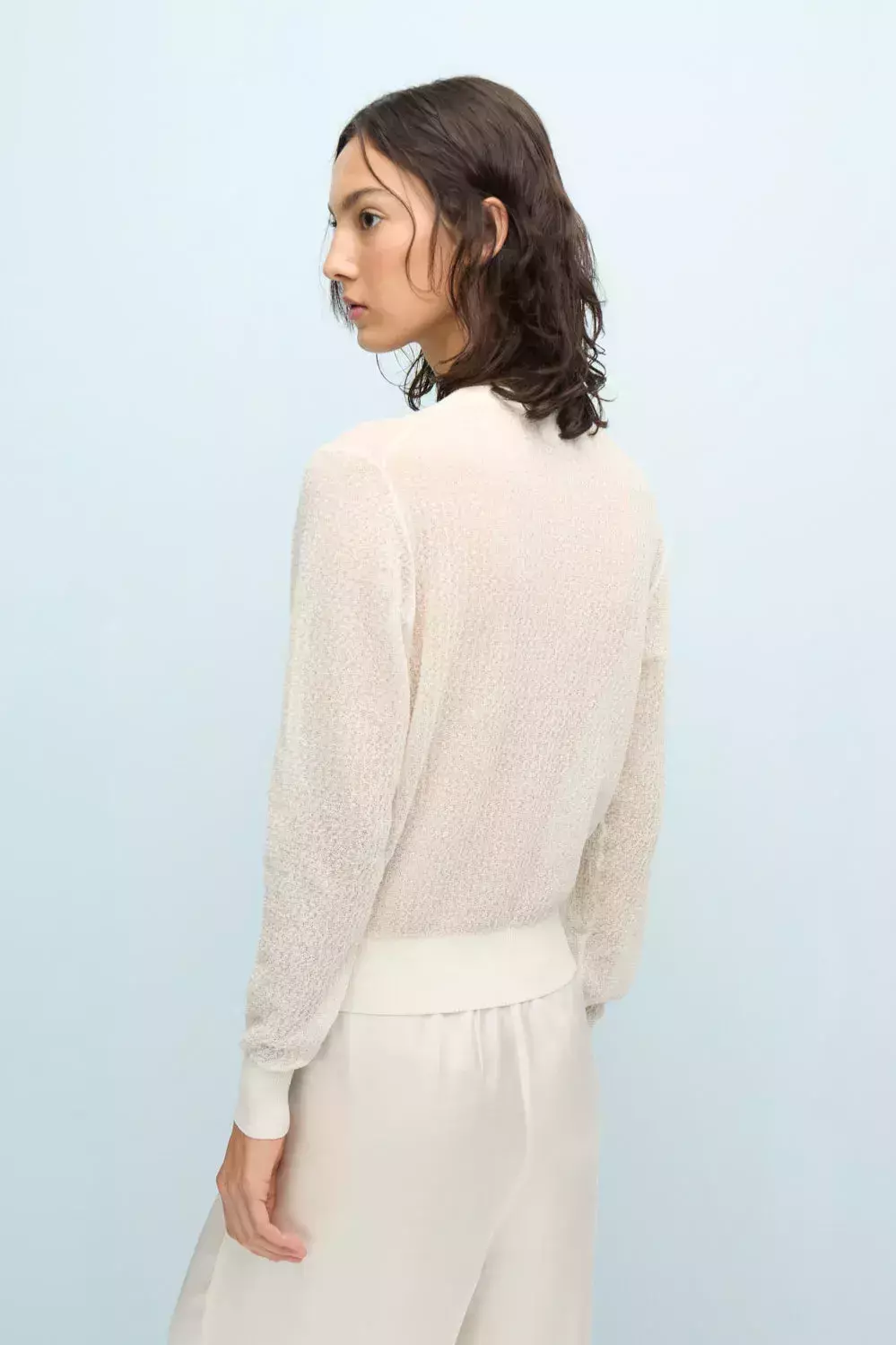 El Sweater Pipa, de hilado con lino, es de calce clásico, escote a la base, manga larga y largo a la cadera. Presenta detalle de bordado en hilo de lúrex acompañando la forma de escote. El tejido semi transparente lo hace una prenda ideal para combinar con tus looks de noche.