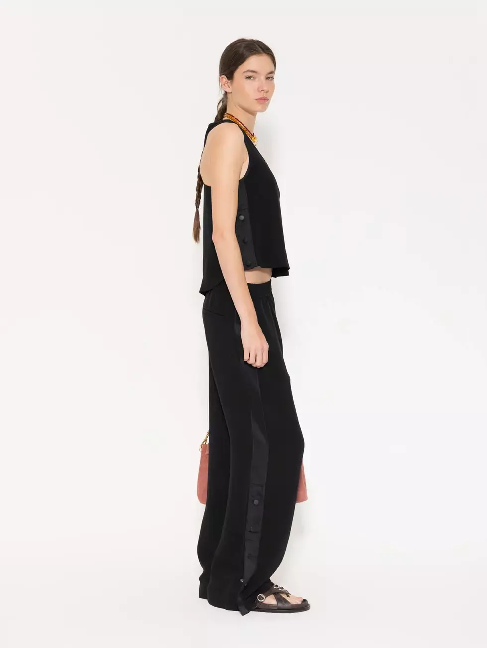 Top Cairo confeccionado en satín doble, de línea A y sin mangas. En los laterales incluye piezas de tela base con broches al tono, grabados con el logo de JCH.
