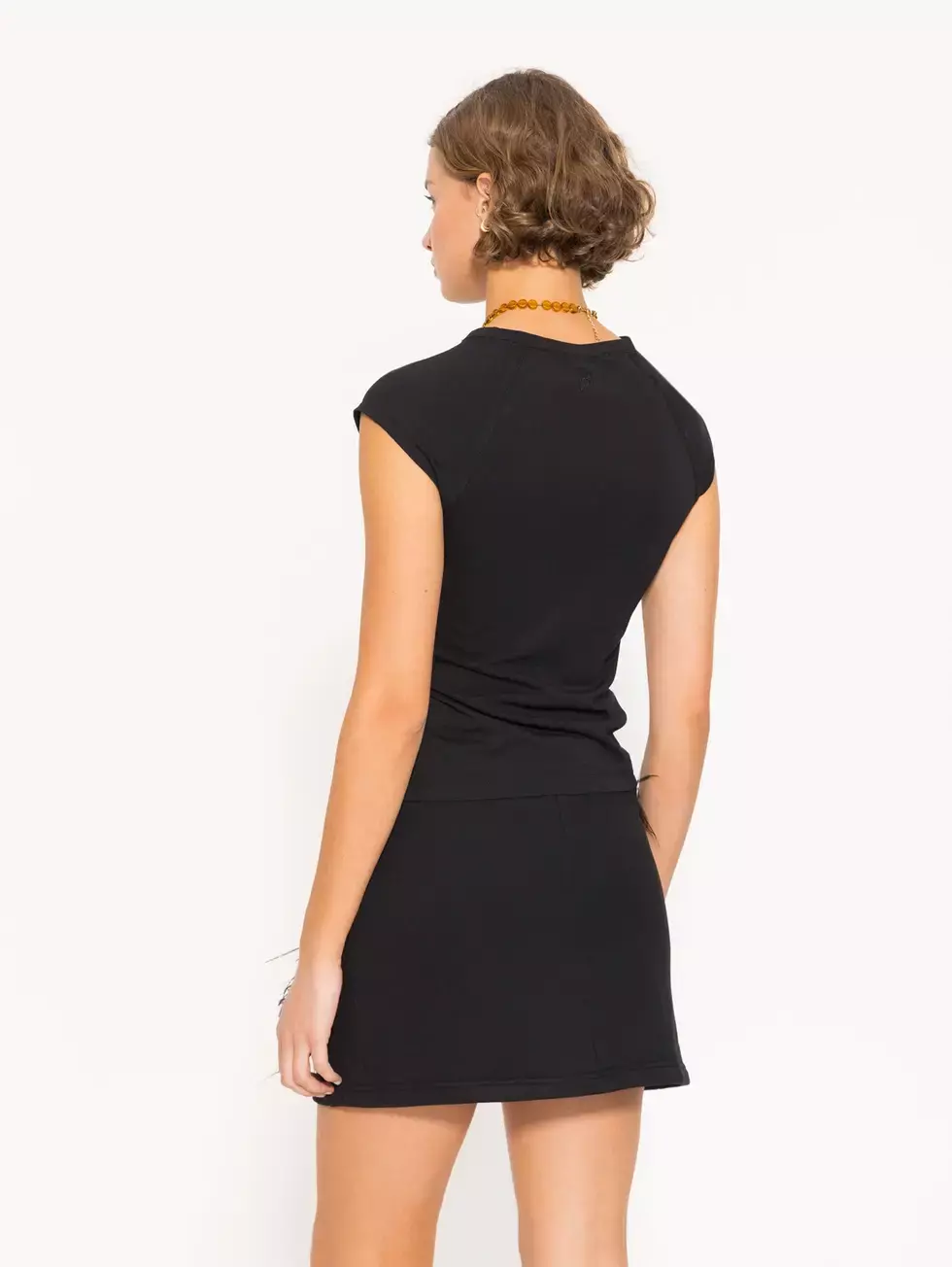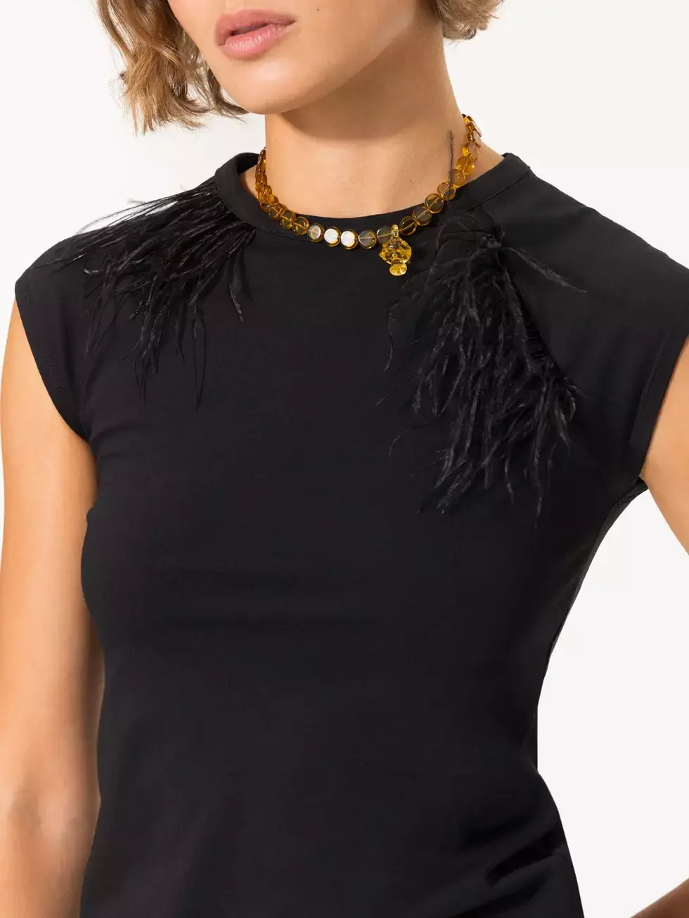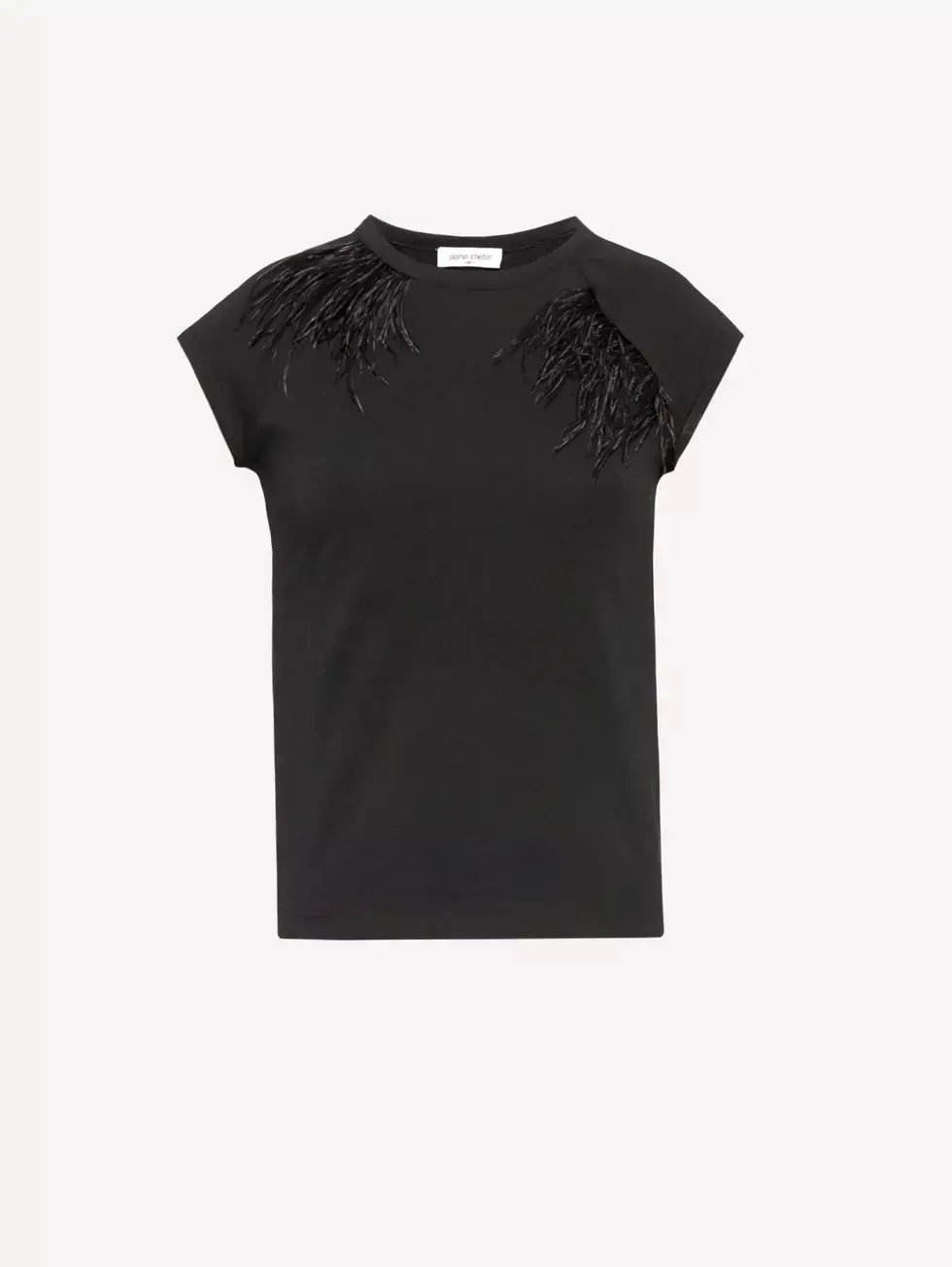 Top Sky confeccionado en tejido de punto, de largo a la altura de la segunda cadera. Presenta cuello redondo a la base y mangas cortas estilo raglán. En el frente lleva plumas aplicadas. En la espalda lleva logo bordado en el centro del escote.