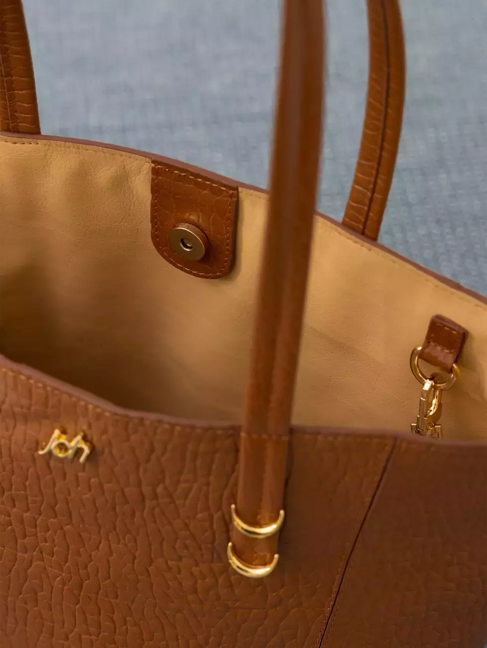 Tote Moon confeccionada en cuero vacuno con correa al hombro, lleva apliques ivory y aplique JCH en la parte delantera. En el interior trae un sobre desmontable.