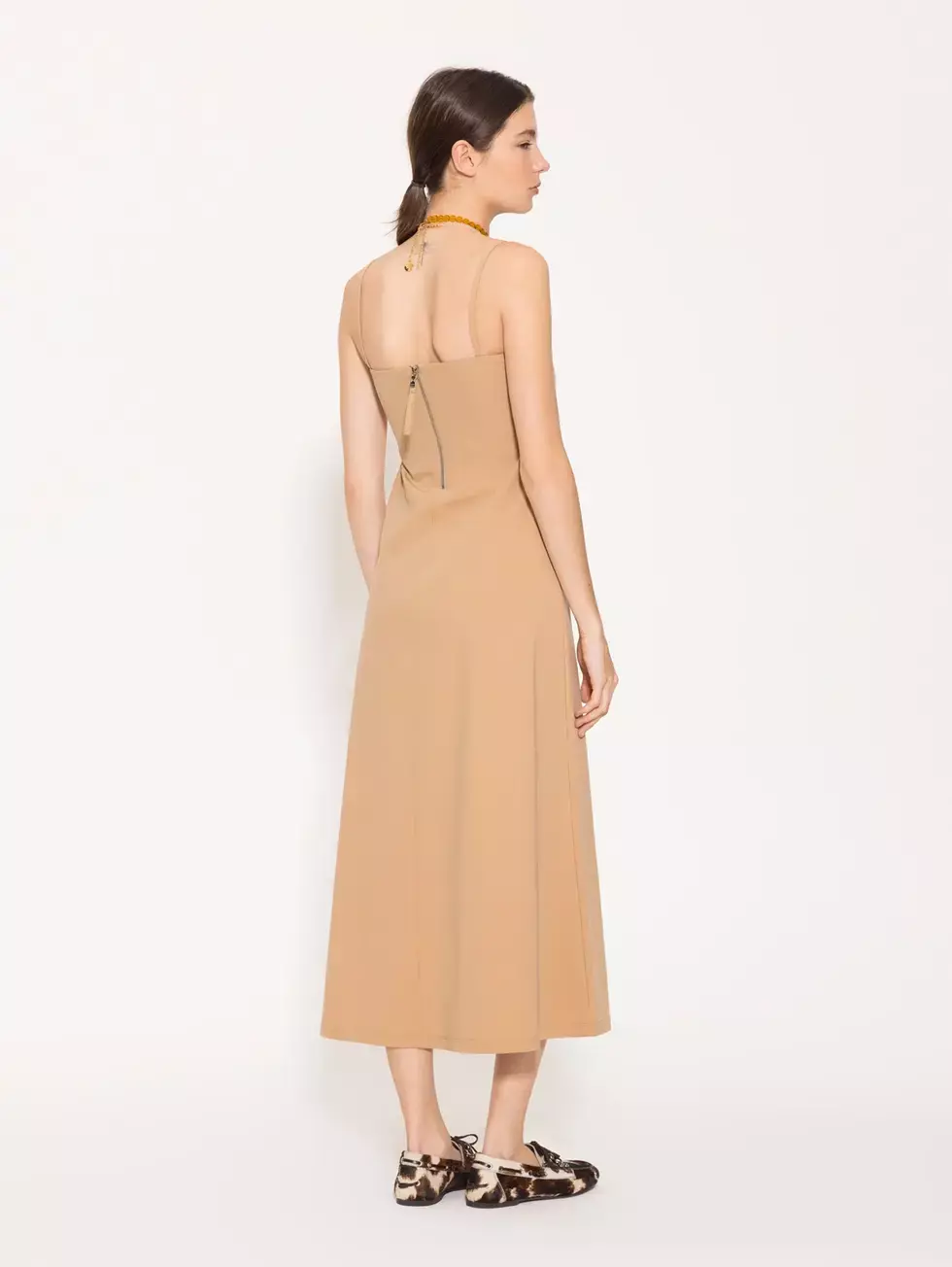 Vestido Aurelia confeccionado en tela de punto lisa, con escote y espalda rectos y breteles en tela base. Presenta línea A hacia el ruedo y acceso mediante cierre en la espalda. Una opción minimalista, cómoda y femenina.