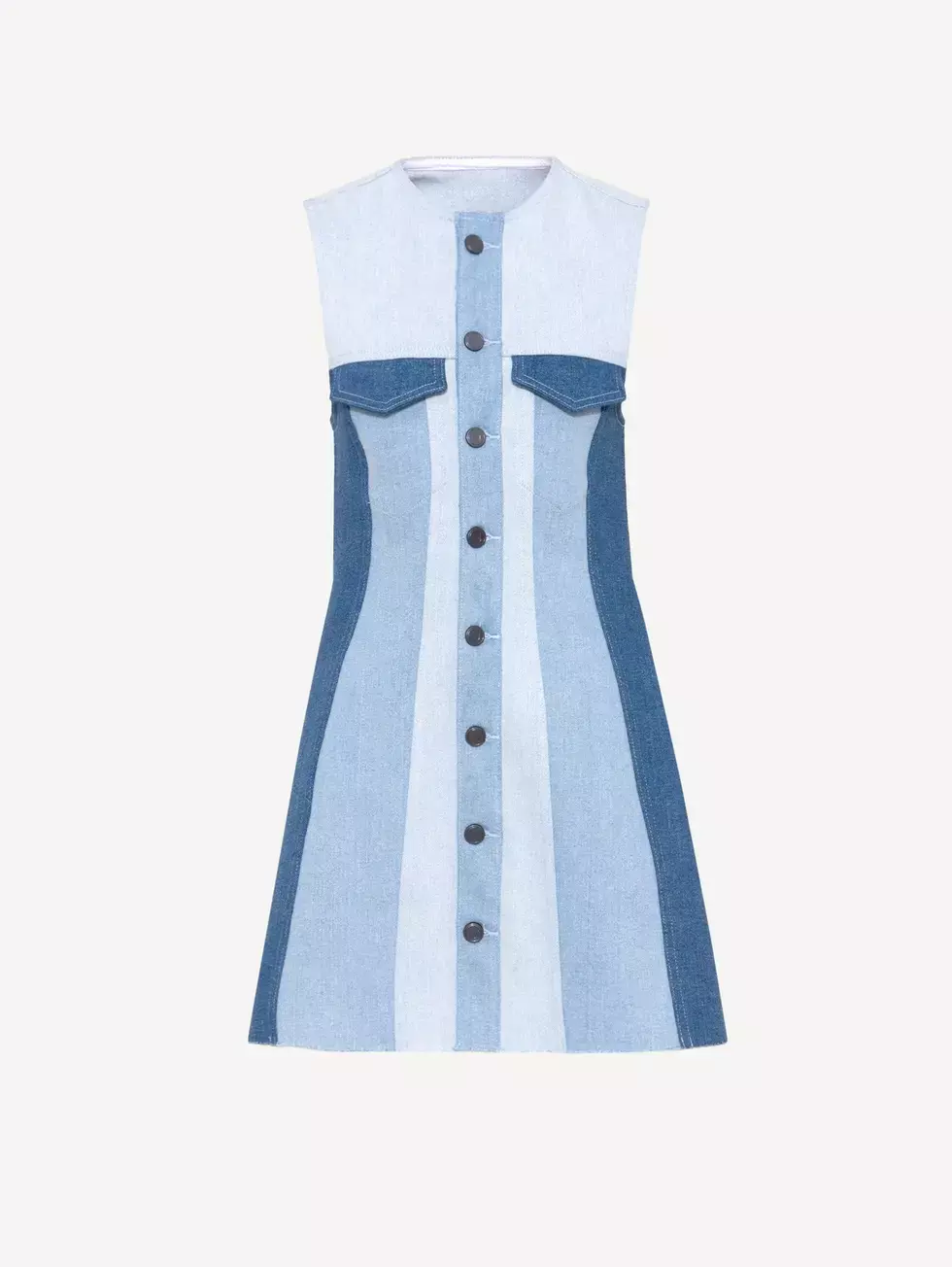 Vestido Debbie de silueta mini y entallada, confeccionado a partir de gajos en diferentes tejidos y tonos de lavado que aportan textura y originalidad. De diseño sin mangas, se adapta al cuerpo con un calce correcto pensado para usarse ajustado. Una prenda femenina y moderna que destaca por su construcción única.