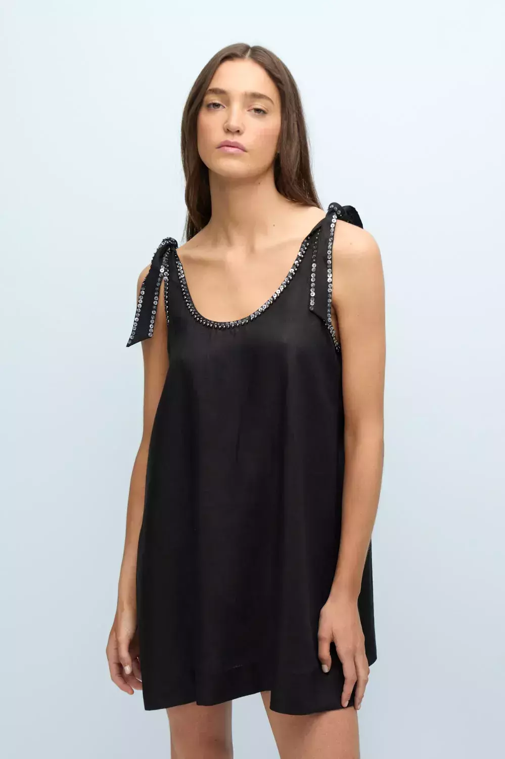 El Vestido Leblon está confeccionado en 100% lino. Fit amplio y silueta evasé, escote de frente y espalda en U y largo hasta arriba de las rodillas. Los breteles son dos tiras de la misma tela, regulables a gusto. Como valor agregado, posee bordado a mano con lentejuelas en el escote, las sisas y los breteles. Usalo tanto en tus looks diurnos como de noche. Es una prenda básica y cómoda, pero con un touch de brillo que le da el toque diferencial.